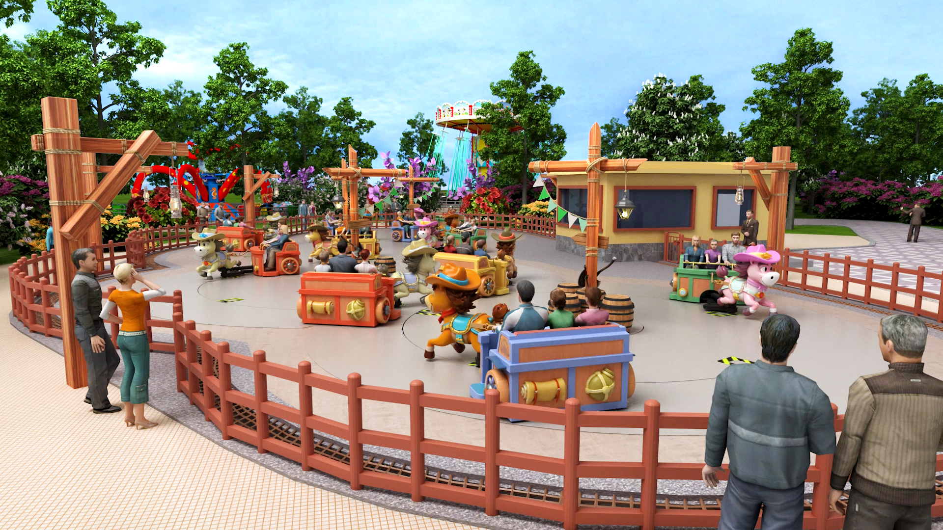 該設(shè)備以胡迪牛仔嘉年華同類設(shè)備為原型,進(jìn)行自主創(chuàng)新設(shè)計(jì)。四個(gè)大小轉(zhuǎn)盤牽引11輛小車同時(shí)旋轉(zhuǎn),小車各自回旋在四個(gè)轉(zhuǎn)盤上,從一個(gè)轉(zhuǎn)盤切換至另一個(gè)轉(zhuǎn)盤不斷循環(huán)。小車精準(zhǔn)自動(dòng)定位,流暢運(yùn)行,形成獨(dú)特的曲線運(yùn)動(dòng),讓乘客充滿驚奇。用戶可定制不同的主題包裝。