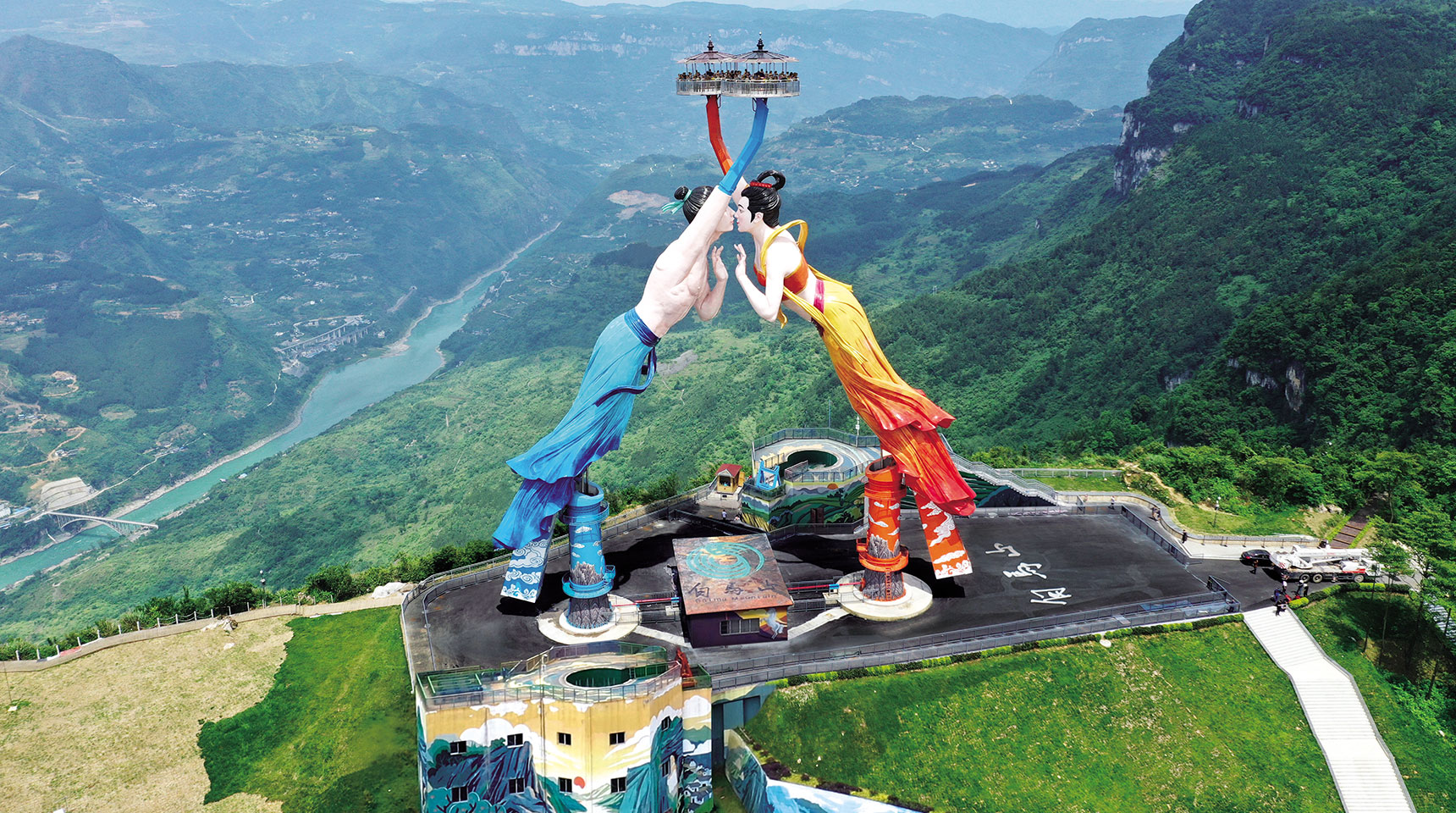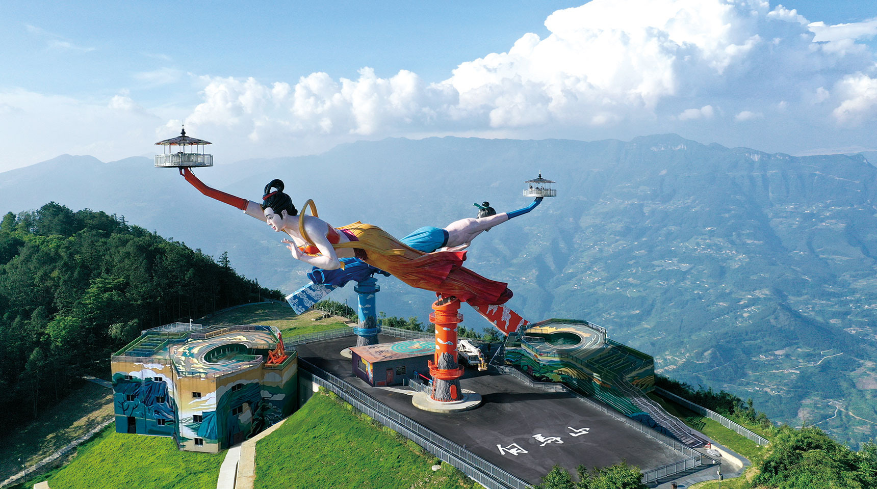 “飛天之吻”的IP形象是全球首創(chuàng)、高達(dá)55米的大型互動式雙飛行島項(xiàng)目,集高空全景式觀光、飛行體驗(yàn)于一身,觀光艙大臂可伸出懸崖40多米,乘客在飛行中能欣賞懸崖立面的全景式壯觀美景。飛行島游樂觀光項(xiàng)目是對傳統(tǒng)景區(qū)高空觀光項(xiàng)目的全新定義?!帮w天之吻”一經(jīng)推出就引起熱議,“網(wǎng)紅”指數(shù)不斷飆升,瀏覽量達(dá)8億人次,受到廣泛關(guān)注,并逐步轉(zhuǎn)化為國內(nèi)外游客,有效實(shí)現(xiàn)了線上流量帶動線下客流,成為典范之作。